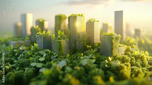 An eco-friendly metropolis set against a backdrop of lush greenery, symbolizing sustainable urban growth and green architecture
