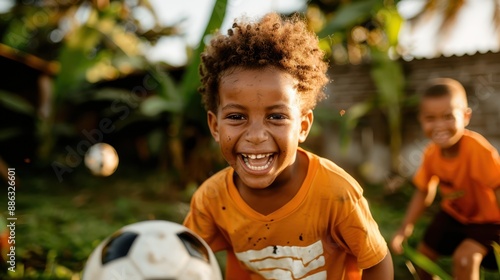 An ecstatic child with a wide smile plays with a soccer ball in an outdoor setting surrounded by greenery, expressing pure happiness and joy in a playful moment.