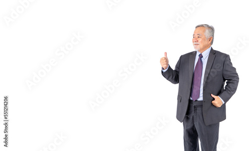 An elderly man with gray hair and a beard, wearing a gray suit and purple tie, smiling and giving a thumbs up with one hand while the other hand is in his pocket, standing against a white background.