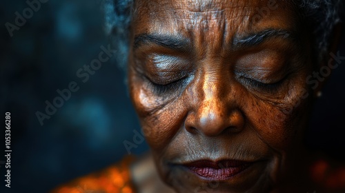 An elderly woman sits in quiet contemplation, her face illuminated by soft light. The intricate details of her features reveal a life rich in experience and emotion, evoking a sense of introspection.