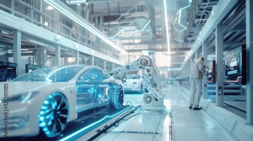 An electric vehicle battery unit in a modern industrial factory. EV trends. Production factory.