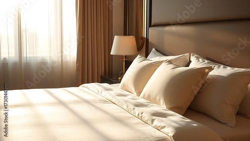 An elegant hotel bed with neatly arranged pillows, softly lit by morning sunlight through sheer curtains.