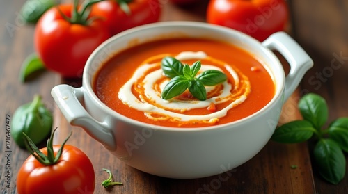 An elegant presentation of tomato basil soup in a white ceramic bowl, topped with a swirl of cream and fresh basil.