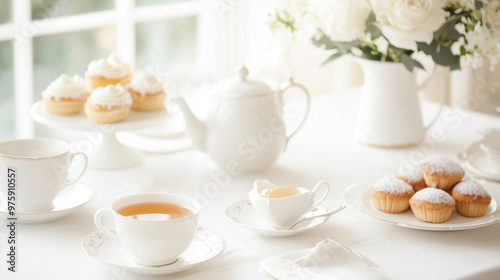 An elegant tea party setting with fine china, delicate pastries, and beautifully arranged teacups on a white background, showcasing sophistication and style. photo