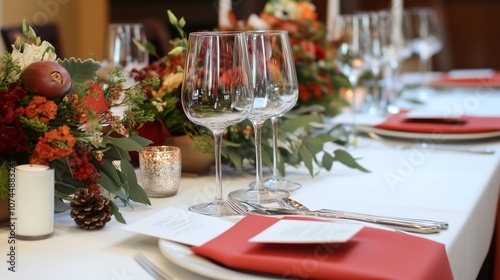 An elegantly set dining table adorned with floral centerpieces and candles, perfect for a festive gathering in autumn