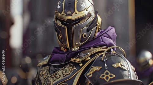 An elite soldier stands at attention wearing a striking combination of gold and purple armor. His expression is one of focus and determination reflecting the rigorous training