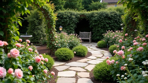 An English garden with stone paths, pastel flowerbeds, a charming bench, climbing vines, and a birdbath centerpiece, offering a romantic and whimsical outdoor retreat.