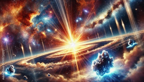 An expansive cosmic vista featuring a glowing supernova explosion at its center, casting vibrant rays of orange, yellow, and white light
