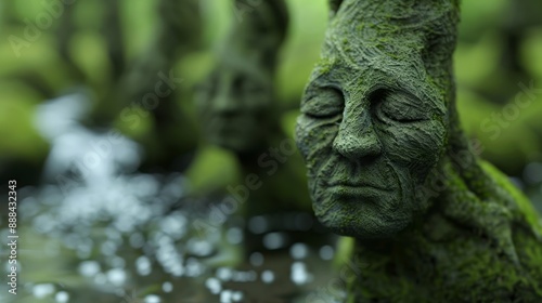 An expertly composed photograph of a forest scene diorama with tree figurines that have detailed expressive faces and a river flowing upwards creating a surreal enchanting atmosphere