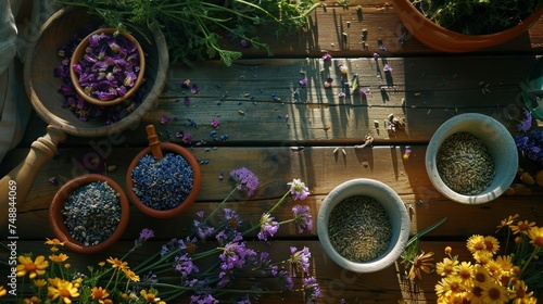 An herbalist's table rich in variety and color, with bowls of dried lavender, chamomile, and rose petals,