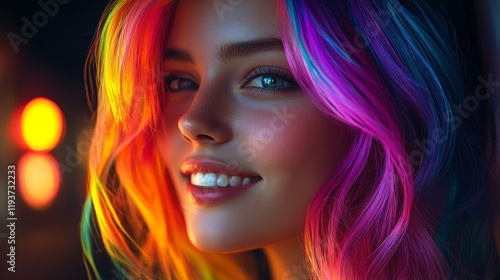 An illustration of a beautiful woman with rainbow hair smiling slightly. Woman with colorful and shiny hair under neon lighting.