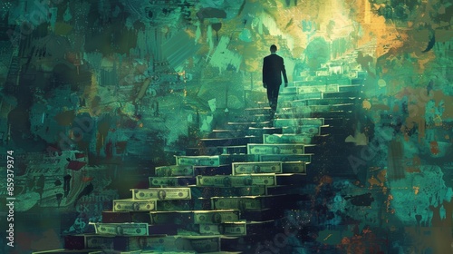 An illustration of a businessman climbing a staircase made of money, representing career advancement and financial success.