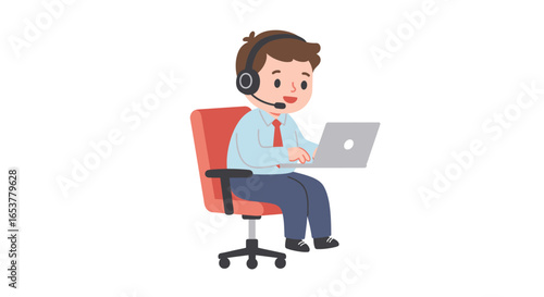 An illustration of a friendly young man wearing a headset and tie, sitting on an office chair while typing on a laptop.