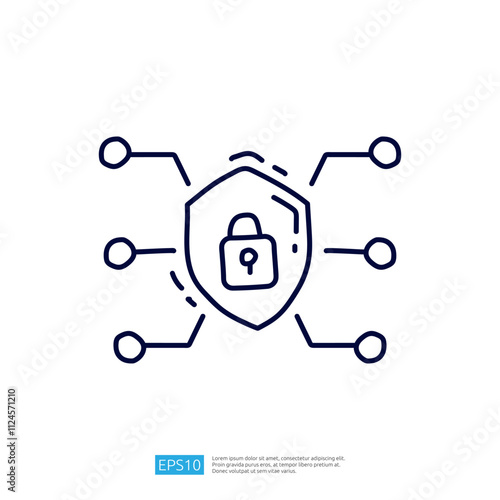 An illustration of a shield with a padlock at its center, connected by lines to various nodes, symbolizing cybersecurity and data protection.