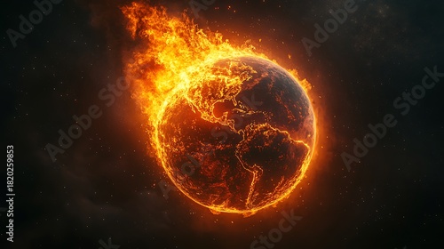 An image of planet earth engulfed in flames with a backdrop of stars in a dark sky view