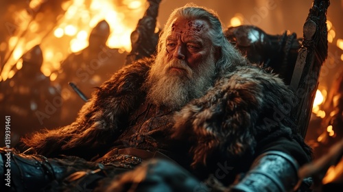 An imposing figure sitting on a throne amidst flames embodies the weight of leadership, sacrifice, and the emotional scars of battles fought in a vivid setting.