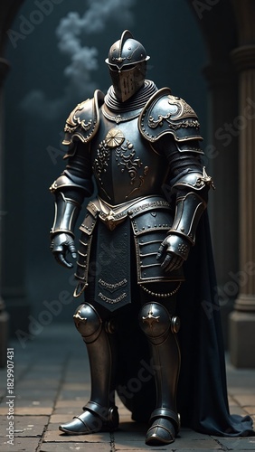 An imposing medieval knight clad in intricately detailed full plate armor, standing sentinel within a grand, dimly lit ancient stone hall, embodying historical might and chivalric protection