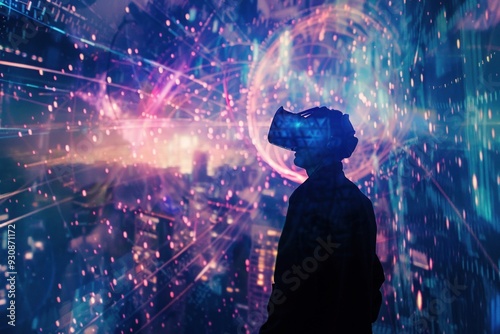 An individual delving into the depths of a virtual reality metaverse, navigating through digital landscapes influenced by cryptocurrency fluctuations
