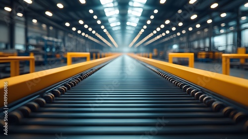 An industrial conveyor belt system in a modern warehouse features empty metal rollers and reflective surfaces under bright ceiling lights, emphasizing a clean and efficient logistics facility.