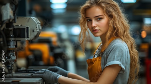 An industrial worker in overalls operates sophisticated machinery at a modern manufacturing plant.