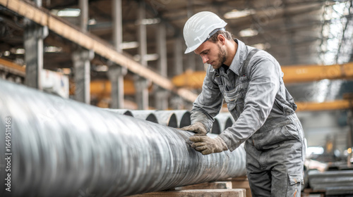 An industrial worker in uniform, with white hard hat and gloves, inspecting large metal pipe in factory setting. Image represents quality control, heavy industry, construction, professional management