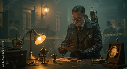 An investigator meticulously reviews evidence at his desk in a dimly lit setting, possibly the scene of a crime