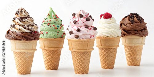 an inviting collection of ice cream cones with different flavors such as chocolate chip, mint, and vanilla, decorated with chocolate drizzle and small berries for garnish