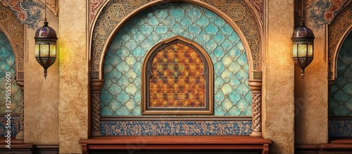 An Islamic-inspired Arabic-style wall with ornate geometric patterns and arches