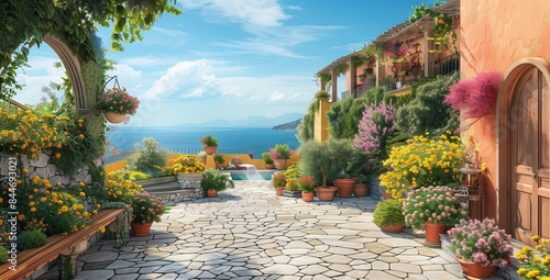 An Italian courtyard by the mediterranean sea full of colorful flowers