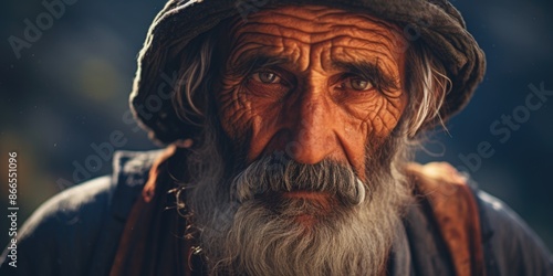 An old man with a beard and a hat is staring at the camera
