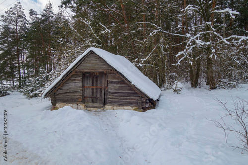 An old picturesque outbuilding near the forest in the village in winter.