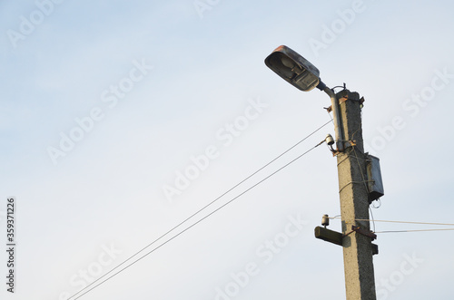 An old street lamp with a choke, insulators and wires on the top of a concrete electric pole against a light blue cloudy sky.