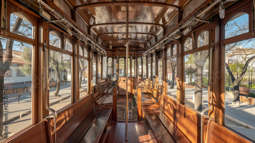 An old tram car in Linares, Spain has wooden seats and ceiling, and large windows. In the distance is the driver's seat with an old steel steering wheel.