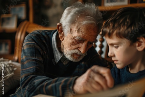 An older man and a young boy reading a book. Suitable for educational and family themes