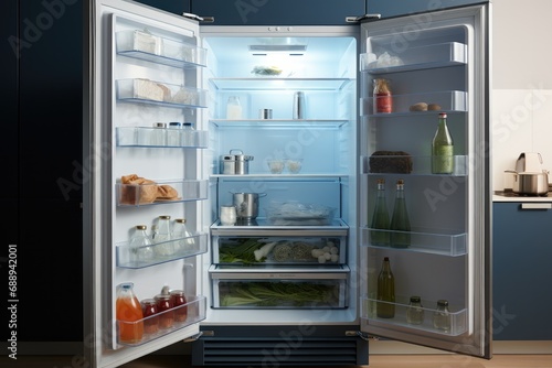 An open cabinet refrigerator, Frozen, Freezing effect, Modern simplicity.