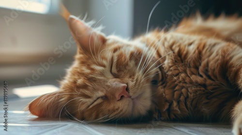An orange cat peacefully sleeping on the floor. Suitable for pet-related designs