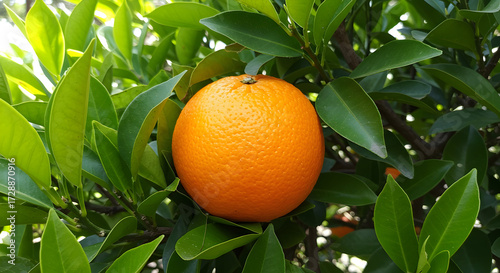 An orange surrounded by its green leaves