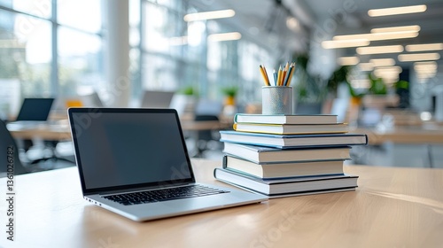 An organized workspace with a laptop computer stack of books and office supplies on a tidy wooden desk in a modern well lit office environment