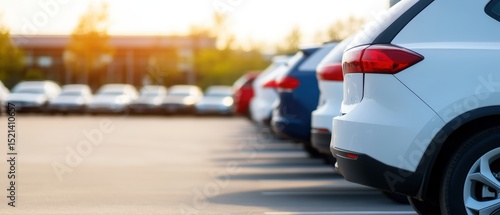 An outdoor car rental and sales lot filled with parked vehicles in a clean structured layout, backed by a dealership office, representing the booming used car market and economic growth opportunities