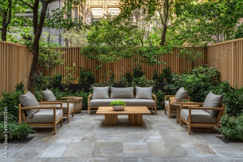 An outdoor living area with patio furniture and trees in the backyard, surrounded by lush greenery