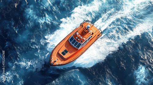 An overhead view of an orange rescue boat with a white wake cutting through choppy blue water.