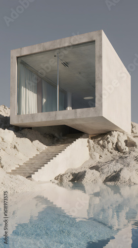 An ultra-modern, minimalist concrete mansion stands alone in a vast, silent desert.