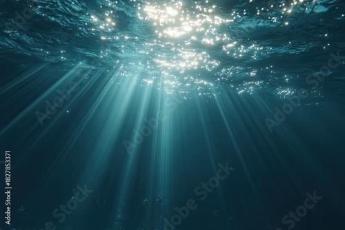 An underwater scene with sunlight beams piercing through the surface. Sunlight filters