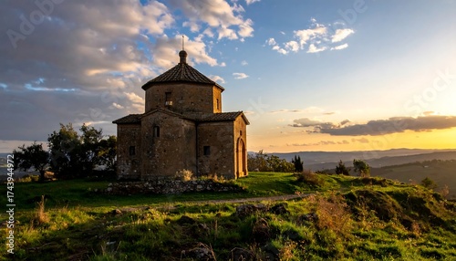 Ancient Chapel on a Hilltop at Sunset in Tuscany.