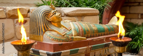 Ancient Egyptian Tomb Entrance with Carved Hieroglyphics Featuring Ankh Symbols and Eye of Horus Motifs in a Sandy Desert Landscape under Clear Blue Sky Illuminated by Warm Natural Daylight