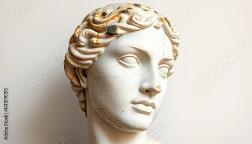 Ancient marble head, serene expression, classical backdrop, ample negative space, museum, copy space