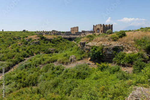 Ancient ruins of Aspendos. In the background. Basilica. Turkey.
