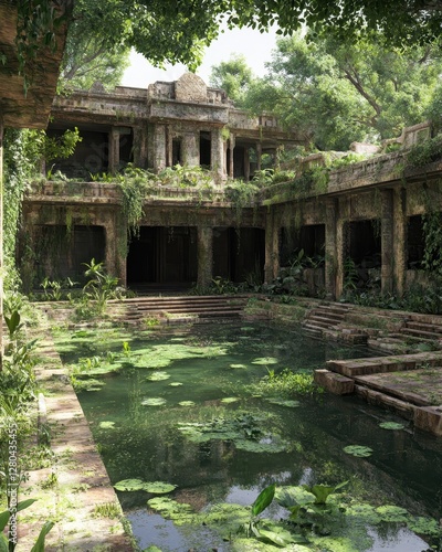 Ancient Ruins Surrounded by Lush Greenery and Serene Water Pool