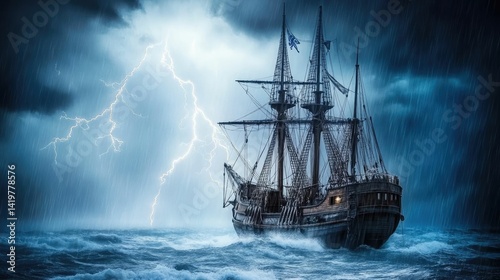 Ancient sailing vessel battles stormy ocean, lightning strikes.