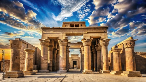 Ancient stone pillars and intricate hieroglyphics adorn the grand entrance of a majestic Egyptian temple, set against a vibrant blue sky with clouds drifted by.